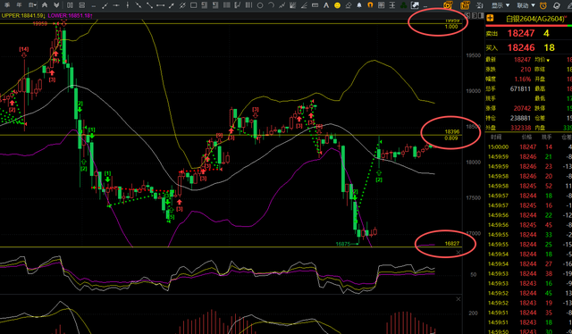 技术指标:今日沪银日内价格处于各周期均线之上,长期上涨结构完好;60分钟RSI约55,处于中性偏强区域,5分钟在18050-18250箱体整理,短期需消化高位压力。