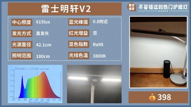 护眼灯哪个品牌最好用又实惠?雷士明轩从光谱图来看,蓝光峰值约为0.8,在百元级台灯中属于不错的表现,适合日常学习使用。但它的不足也比较明显,它的光谱连续性来看一般,蓝光与绿光之间的衔接部分较少,存在一定的断层现象;而且采用的是直发光设计,直发光意味着光线是从灯头直射而下,没有经过侧发光那样的扩散柔化,这会导致在如此大的照射范围内,光线均匀性很难做好。