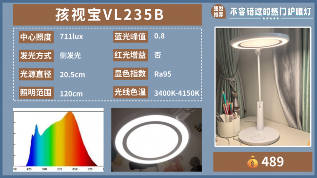 护眼灯哪个品牌最好用又实惠?孩视宝VL235B机身用白色铝合金搭配ABS材质,多关节支架调节起来很灵活,能适配不同桌面的照明角度,放置在桌上也比较稳。光源是面环双光源设计,面光源向下打基础光,环光源斜向补光,再搭配侧发光技术,光线整体偏柔和。它的色温能在3400K-4150K之间调节,还带智能感光和15分钟自然睡眠模式,日常用起来比较省心。不过这款台灯也有明显缺点,它采用蓝光激发全光谱,蓝光峰值接近1.0,在护眼的核心表现上比较一般,整体护眼效果不算突出。