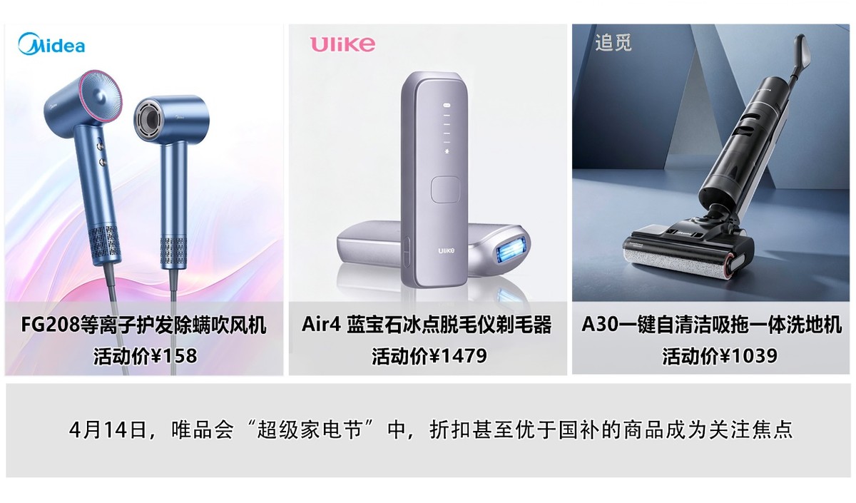 以特卖电商唯品会为例,其4月14日上线的“超级家电节”中,美的等离子高速吹风机低至158元,追觅A30洗地机到手价仅1039元。这两个价格甚至比此前国补期间的售价还要低。平台相关负责人透露,这类深度折扣商品成为活动中最抢手的爆款。