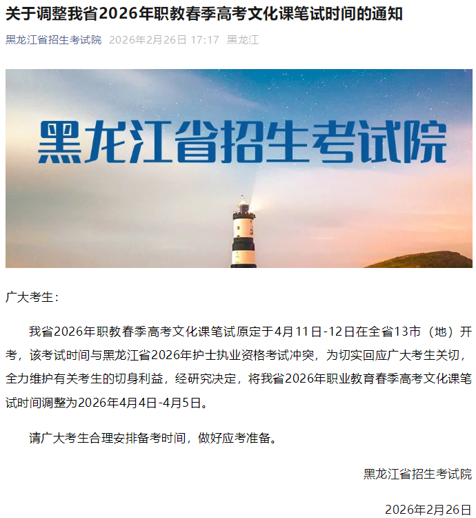 2026年2月26日下午17点多黑龙江省招生考试院发布通知,原定于4月11日-12日在全省13市(地)开考的黑龙江2026年职教春季高考文化课笔试,因与黑龙江省2026年护士执业资格考试冲突,调整到2026年4月4日-4月5日举行。