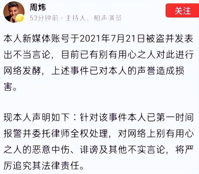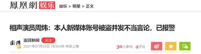 澎湃新闻-2021-07-23——《相声演员周炜:本人新媒体账号被盗并发不当言论,已报警》