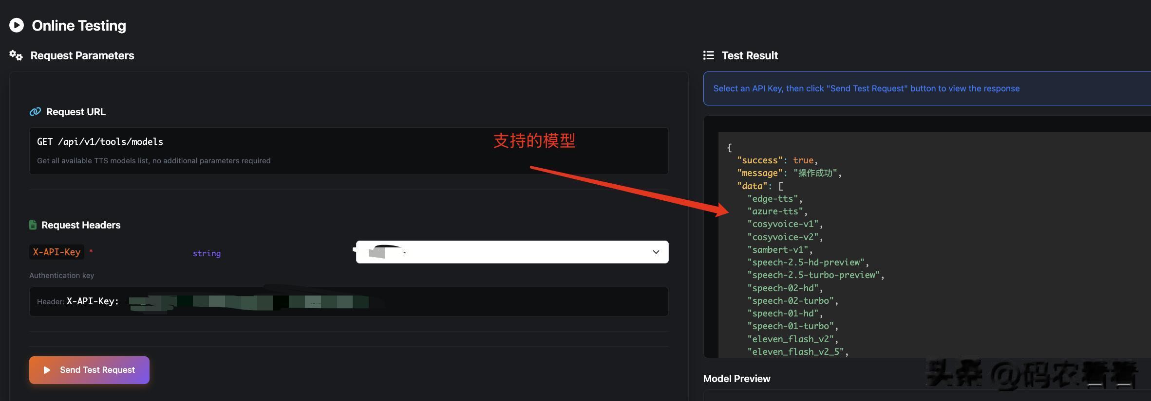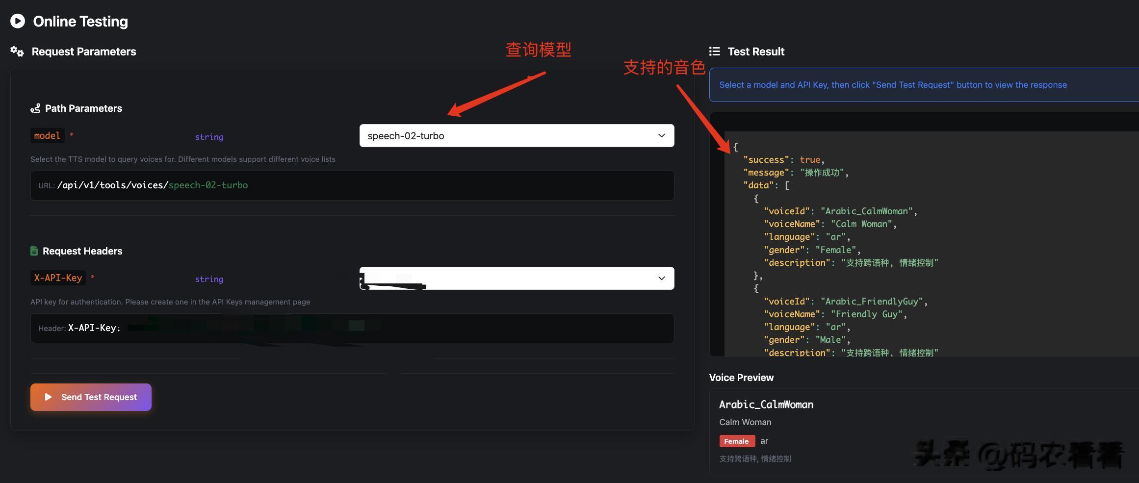 每个模型下支持的voice,也可以调用接口查询,比如这里尝试调用minimax支持的voice:
