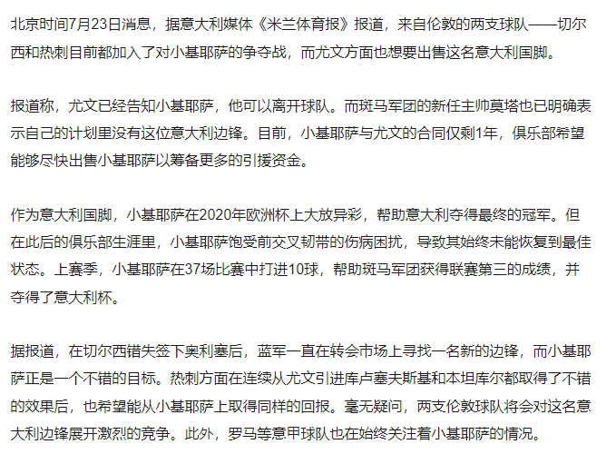 伦敦双雄之争!曝切尔西和热刺都想签下小基耶萨 尤文已放行