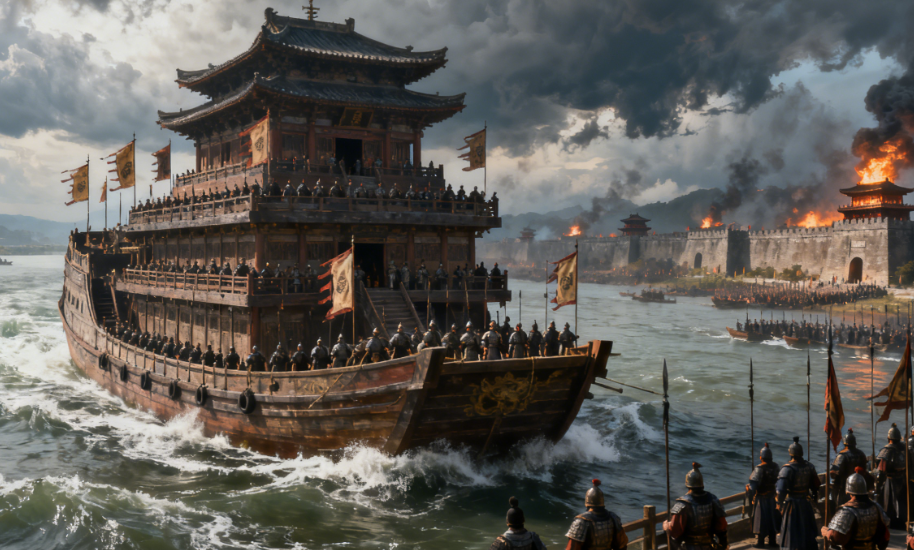 益州刺史王濬站在新建的楼船顶层,眺望着滚滚东流的长江水。这艘七层战舰“飞云号”如同水上城堡,船板上可驰骋战马,船楼中可藏千兵。