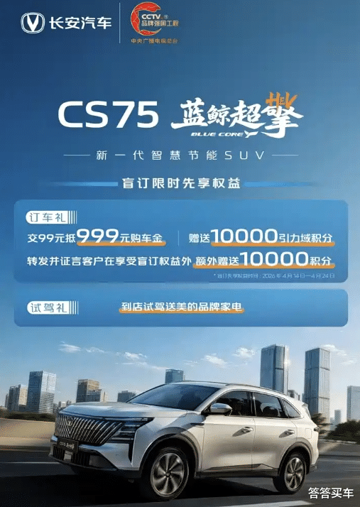 4月14日,长安汽车发布了第四代CS75PLUS蓝鲸超擎车型的配置信息、并同步开启该车的盲订。盲订期间的具体优惠请见下图:
