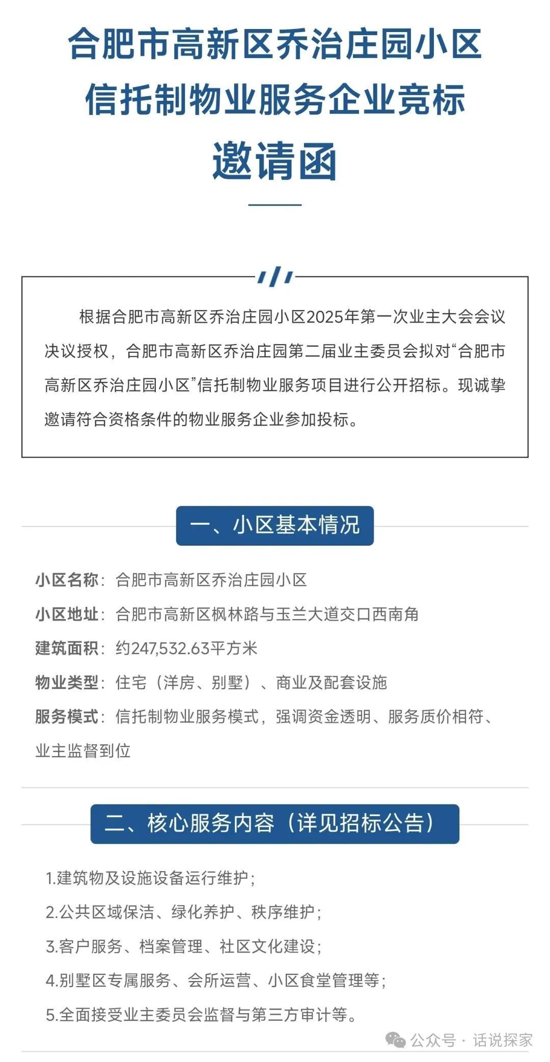 邀请函显示,根据该小区2025年第一次业主大会会议决议授权,小区第二届业主委员会拟对乔治庄园小区信托制物业服务项目进行公开招标,具体如图所示。