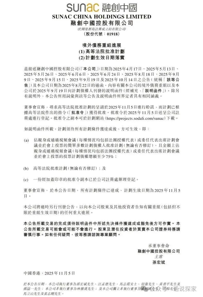 11月5日,融创发布公告,称96亿美元境外债重组获香港高等法院裁定生效,成为首家境内外债务基本清“零”的大型房企。
