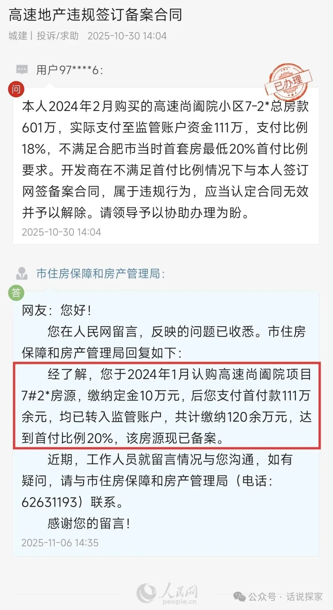 此前,网友在人民网领导人留言板反映瑶海区置地中心柏悦天翠二期工程减配降标、虚假宣传,提到了存在五个方面的问题,目前官方回复来了。
