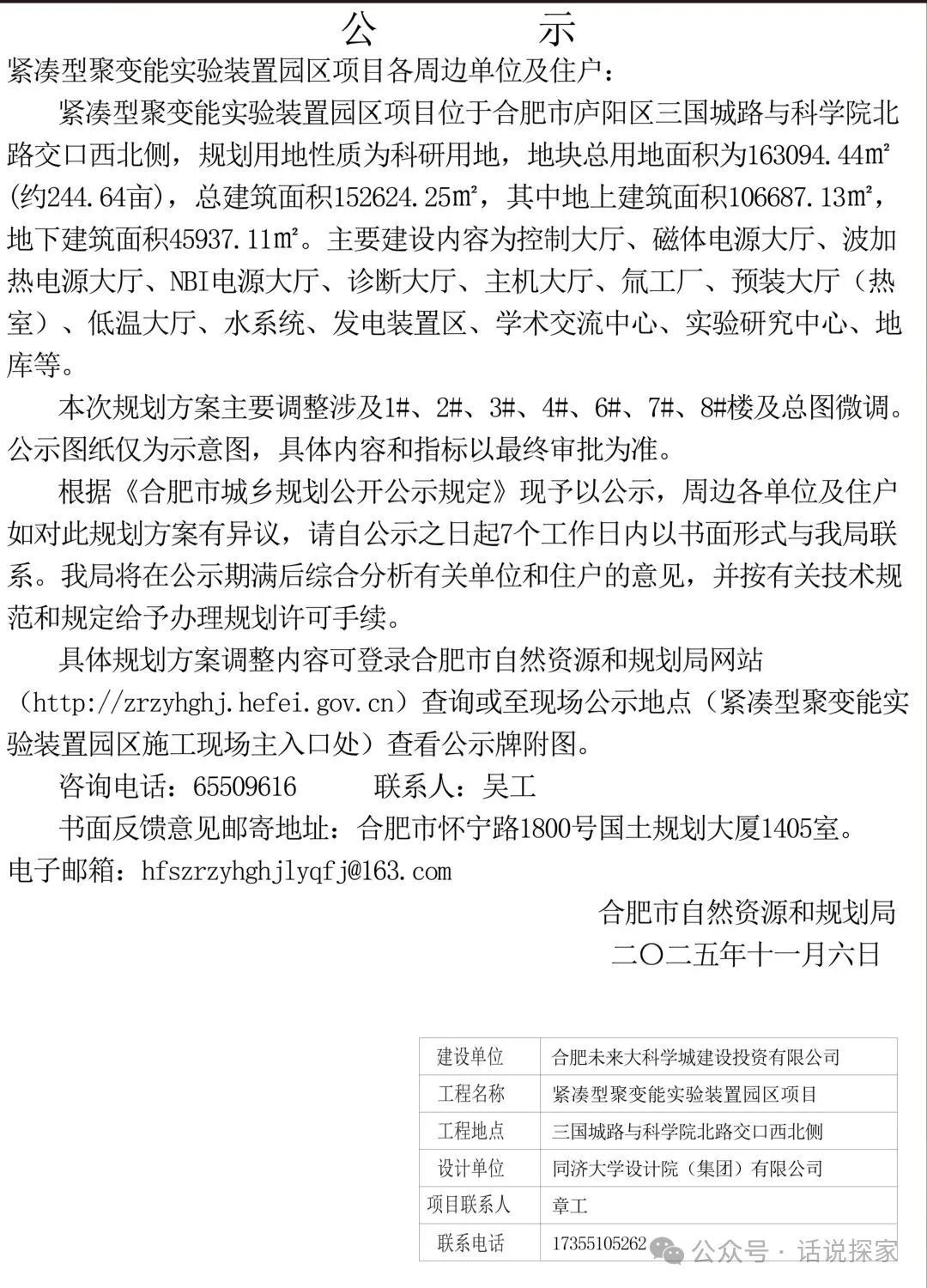 紧凑型聚变能实验装置园区规划方案调整公示,项目位于合肥市庐阳区三国城路与科学院北路交口西北侧,规划用地性质为科研用地,地块总用地面积163094.44m(约244.64亩),总建筑面积152624.25m,其中地上建筑面积106687.13m,地下建筑面积45937.11㎡。