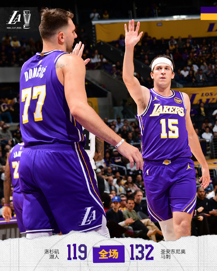 NBA杯1/4决赛,湖人在主场以119-132不敌马刺,无缘半决赛。湖人今天让马刺得到132分,也创本赛季单场失分新高。在7连胜被终结之后,湖人过去5场比赛输掉3场,战绩来到17胜7负,排名从西部第二跌至第四,并且和马刺打成平手,但凭借太平洋赛区冠军优势暂时排在马刺前面,马刺依旧排在西部第五。