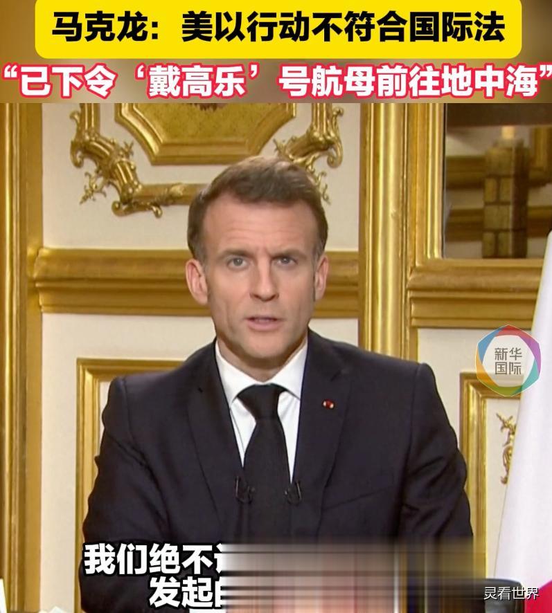 马克龙做了两件事,首先是鉴于中东局势不确定性,命令戴高乐号航空母舰连同40架舰载机和护卫舰启航前往地中海,其次是,公开谴责美国和以色列发起的军事行动不符合国际法。