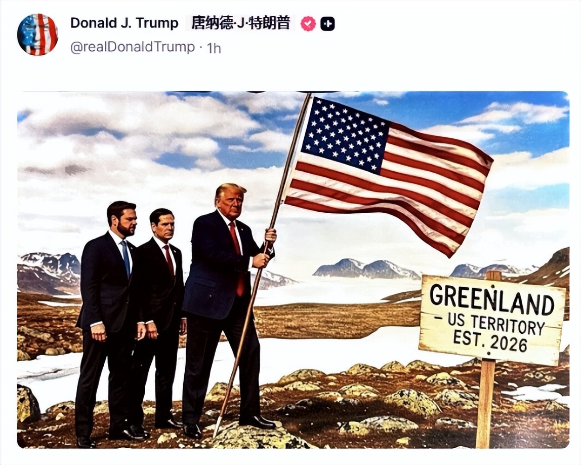 所以,特朗普在20日凌晨迅速发布了一张照片:画面中,他本人将一面美国国旗插在格陵兰岛上,身后是国务卿鲁比奥和副总统万斯,旁边立着一块牌子,赫然写着“格陵兰岛2026年成为美国领土”。