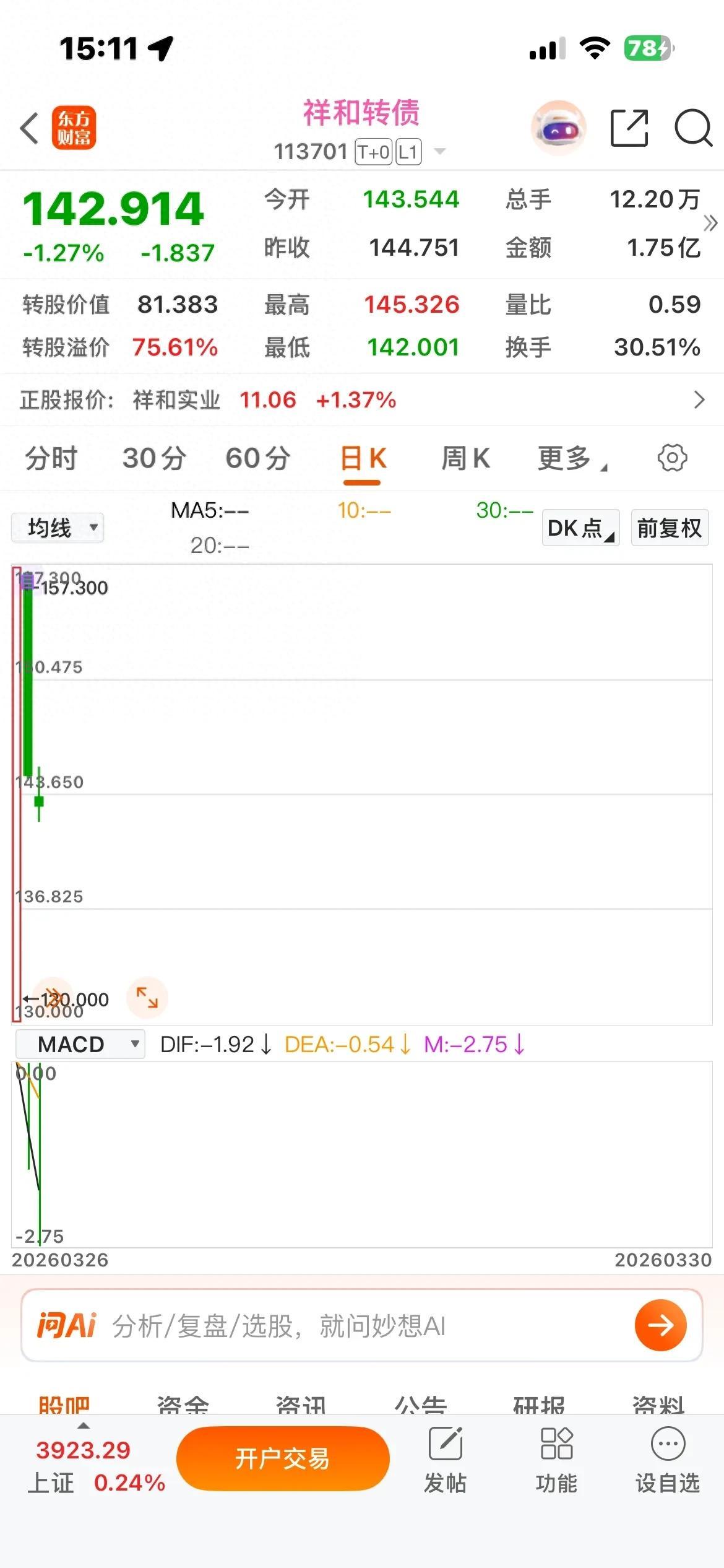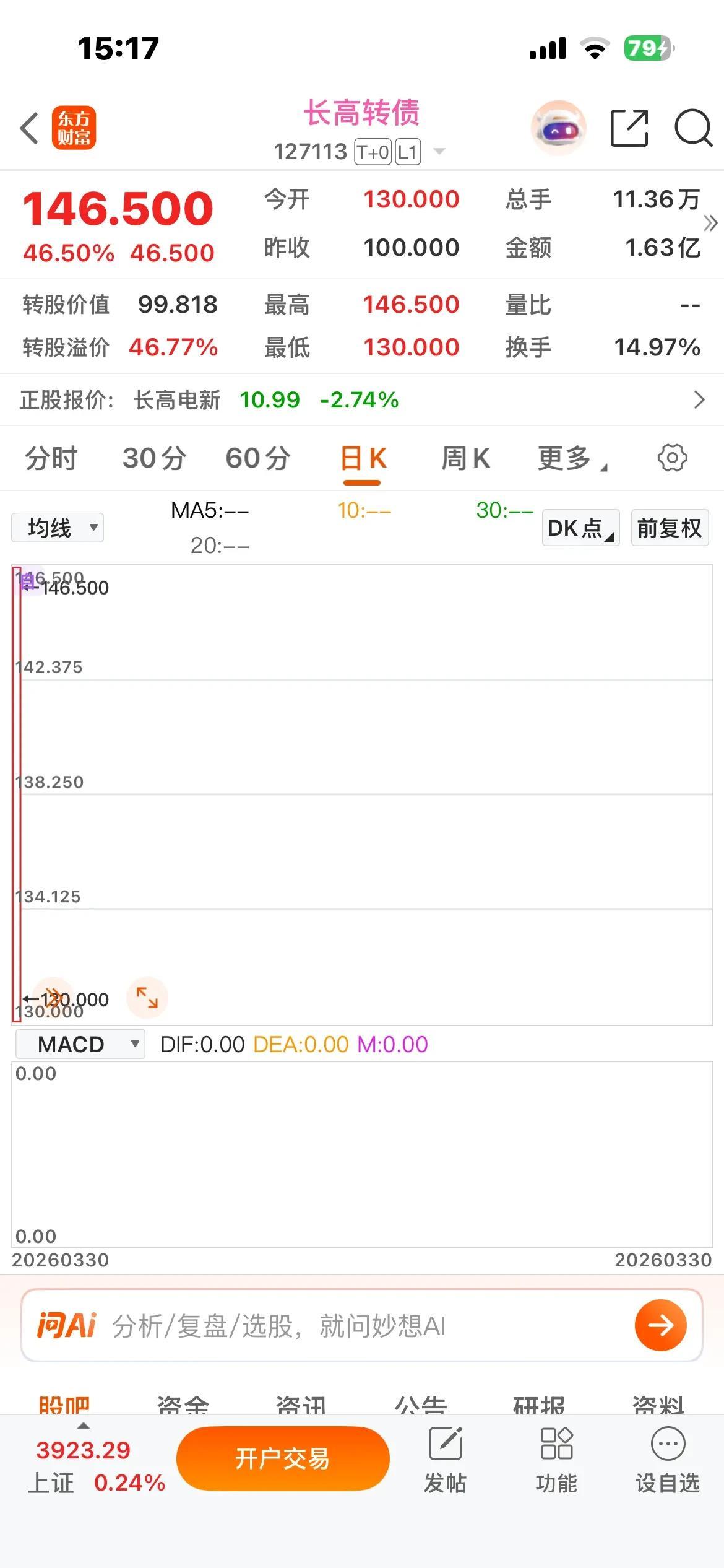 深市,长高转债,今天上市,尾盘没有封死157.3元,报收146.5元,溢价率仅有46.77%,正股小跌2.74%。