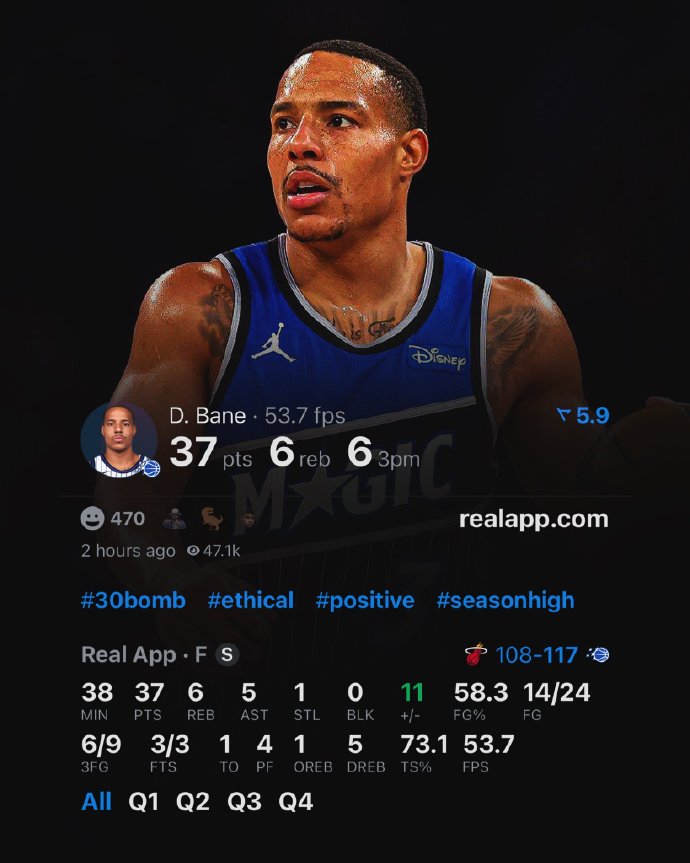 NBA杯1/4决赛,凭借贝恩的大爆发,魔术在主场以117-108击败热火,成功晋级4强,将继续向冠军发起冲击,每位球员也