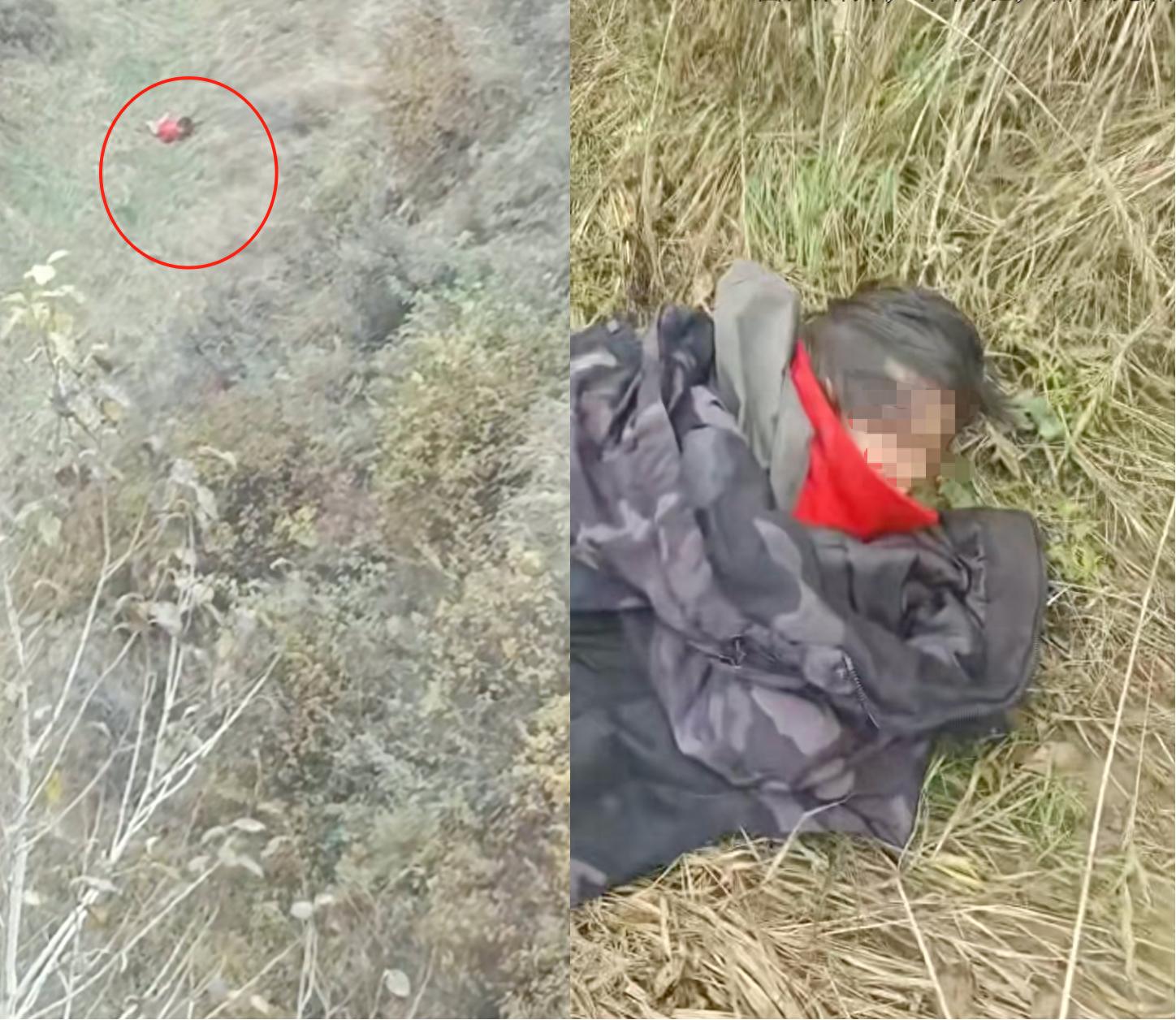 10 月 17 日早上 8 点 40 分,无人机操作手突然在山沟里的一处山洞内,发现了那抹显眼的红色身影