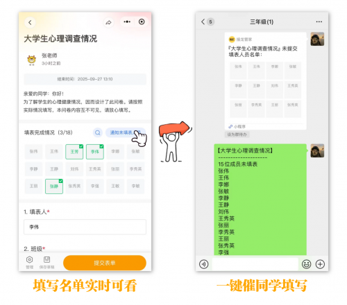 遇到拖延的同学,还能一键复制未提交的人员名单,直接转发到群里提醒,无需再挨个私聊催促,省心又高效。