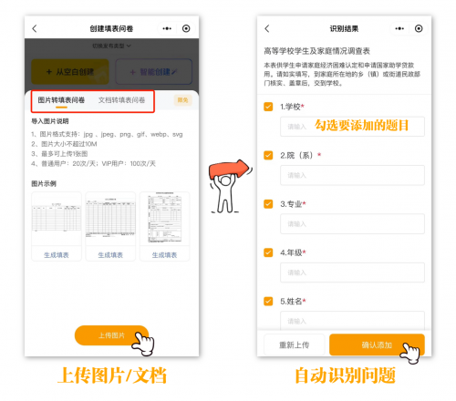 支持“智能创建”,只需将现成的心理健康调查文档或图片上传,系统便能自动识别并转换为可填写的问题,完全无需手动挨个输入,大大节省了创建时间。