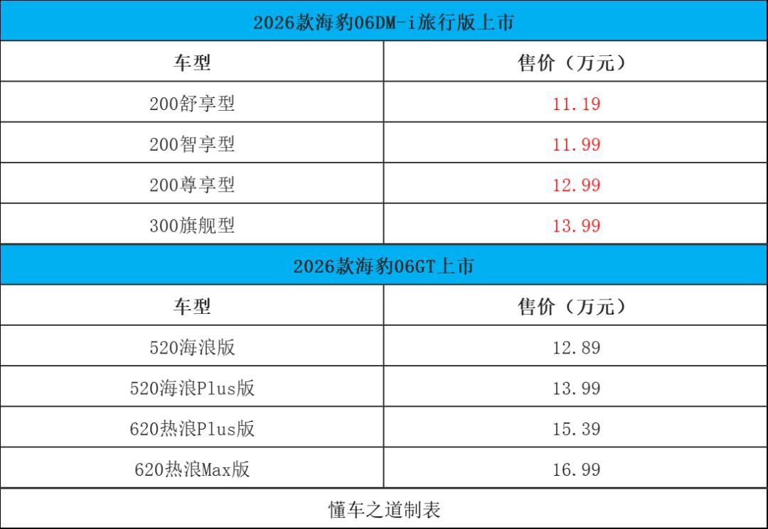4月2日,我们从比亚迪官方了解到,2026款海豹06GT和2026款海豹06DM-i旅行版正式上市,前者共推出4款配置,售价区间为12.89-16.99万元;后者共推出4款配置,售价区间为11.19-13.99万元。