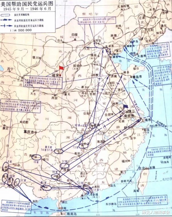 抗战胜利后,驻华美军的首要任务是协助国民党接收日军投降、维持社会秩序以及帮助国民党军队抢占战略要点。美海军第七舰队于1945年8月编为五个特遣舰队执行在华任务,除了帮助国民政府运兵、巡逻沿海和长江流域,还直接运送了美国海军陆战队5.3万兵员到华北地区,协助国民党军队接收天津、青岛等重要城市,受降日军10万余人。美海军还运输国民党军队登陆秦皇岛,美空军则运送驻扎京津的国民党军队直飞东北抢占沈阳和长春等要地。与此同时,美军观察组依然在延安等地与中共接触,以促进国共谈判和“民主联合政府”组建。