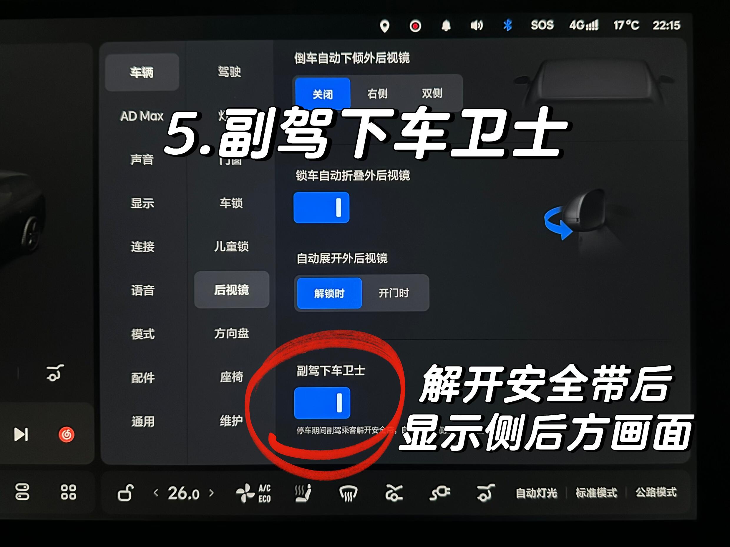 5️⃣副驾下车卫士:车辆—后视镜—副驾下车卫士,副驾解开安全带后会在副驾屏上显示侧后方影像✅