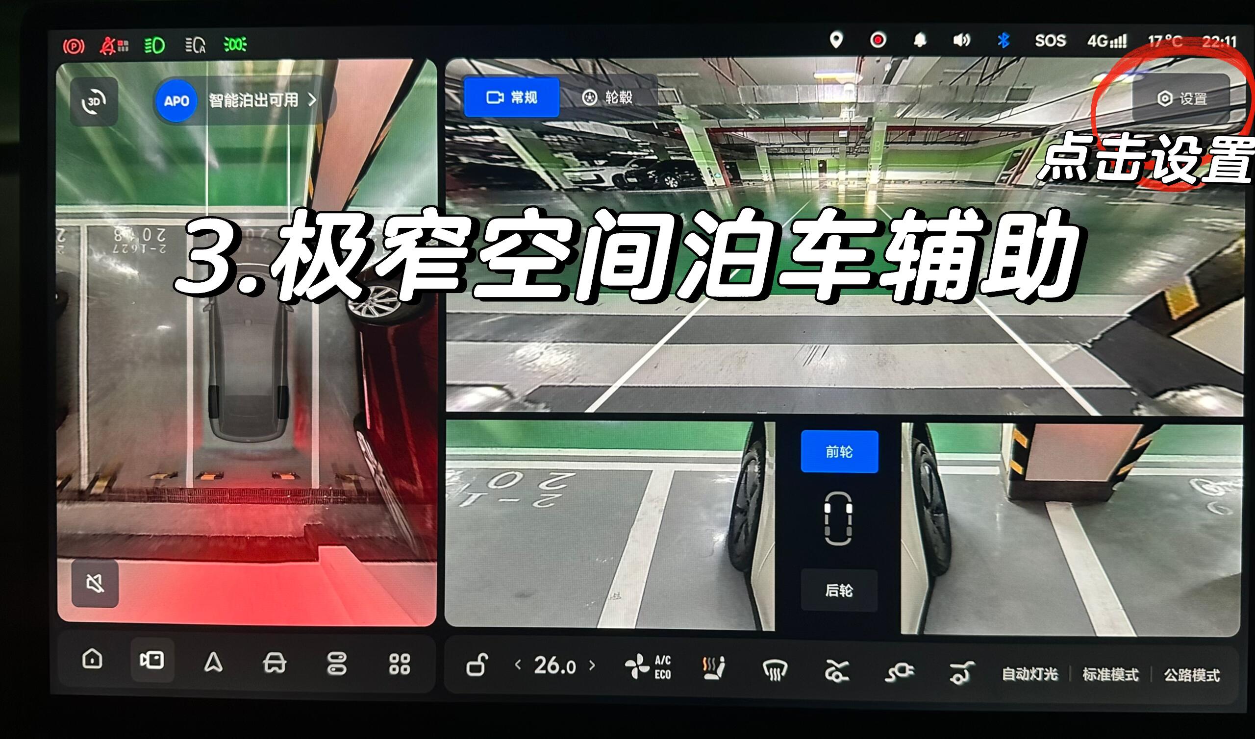 3️⃣极窄空间泊车辅助:在全景影像的设置中打开,当车辆距离障碍物极近时会显示放大图,辅助泊车,但实测盲区较大,仅做辅助使用✅
