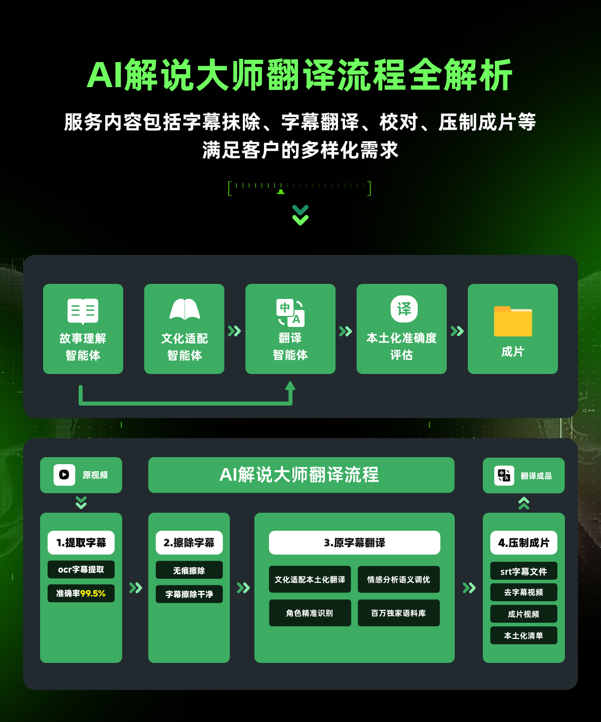 核心功能: 字幕识别 → 多语种翻译 → 配音合成 → 字幕擦除,全链路一体化,无需跨工具操作,一站式交付,无需自己人工操作,非常方便节省人力。