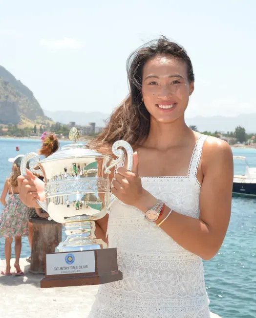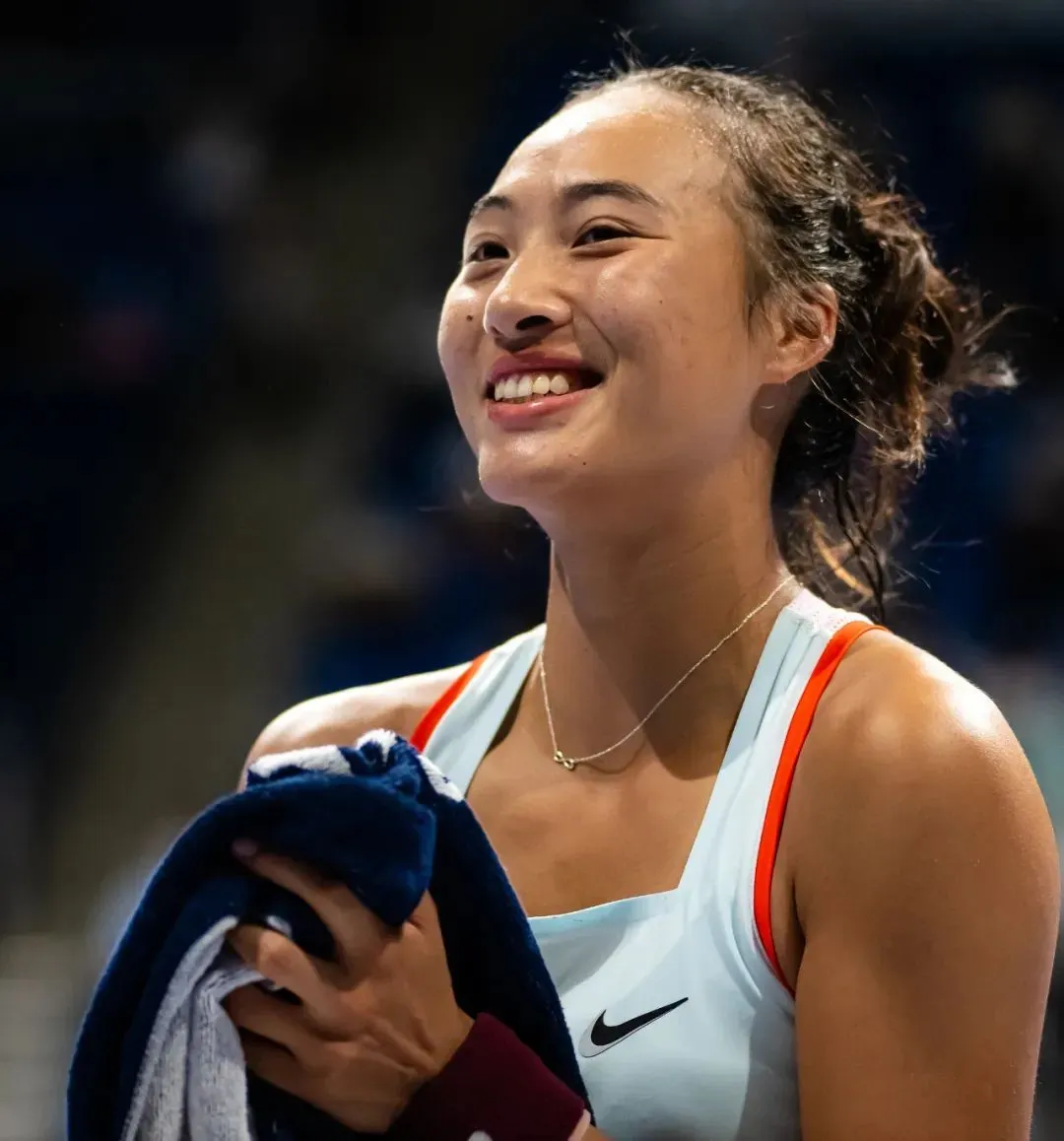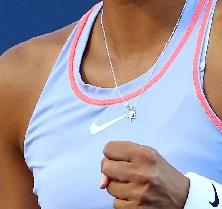 这款项链,吊坠是一只非常迷你可爱的网球拍和网球。随着郑钦文奔跑挥臂时身体的跃动,吊坠也和她手中的网球拍一起上下挥舞。