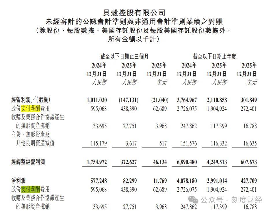 2026年3月,贝壳(HK02423)披露2025年年度业绩报告,其中19.04亿元的股份支付薪酬费用成为市场关注的焦点。相较于2024年27.26亿元的规模,这一数字虽有回落,但在公司净利润同比下滑26.7%的背景下,依旧引发了广泛争议。