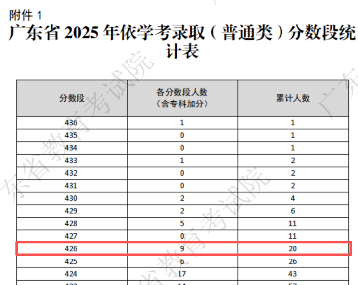 例如在广东省2025年春季高考依学考录取一分一段表中,“426分以上”区间的分数段人数为9,代表有9名考生获得该分数,累计人数为20,则意味着426分及以上共有20名考生。