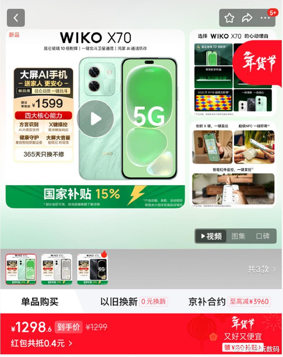 当然,如果你也对这款“东哥同款手机”“光明村大爷同款手机”感兴趣,想要买来自己用,或者送给长辈。现在就可以上京东/抖音搜“WIKO X70”,正值年货节,下单还可享,最高补贴500元,365天只换不修,福利也拉满,是个非常不错的选择。