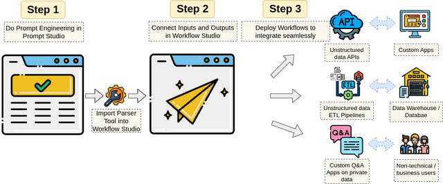 通过简化的三步骤,用户可将文档添加到无码 Prompt Studio,进行提示工程以提取所需字段,然后配置并部署为结构化数据 API 或 ETL 管道。