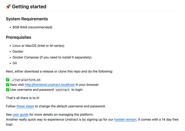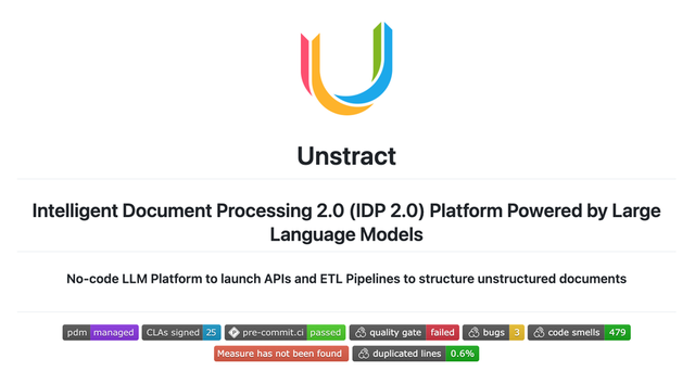 项目介绍Unstract 是一个基于大型语言模型的智能文档处理 2.0 平台,旨在无需编码即可启动 API 和 ETL 管道,以结构化非结构化文档。
