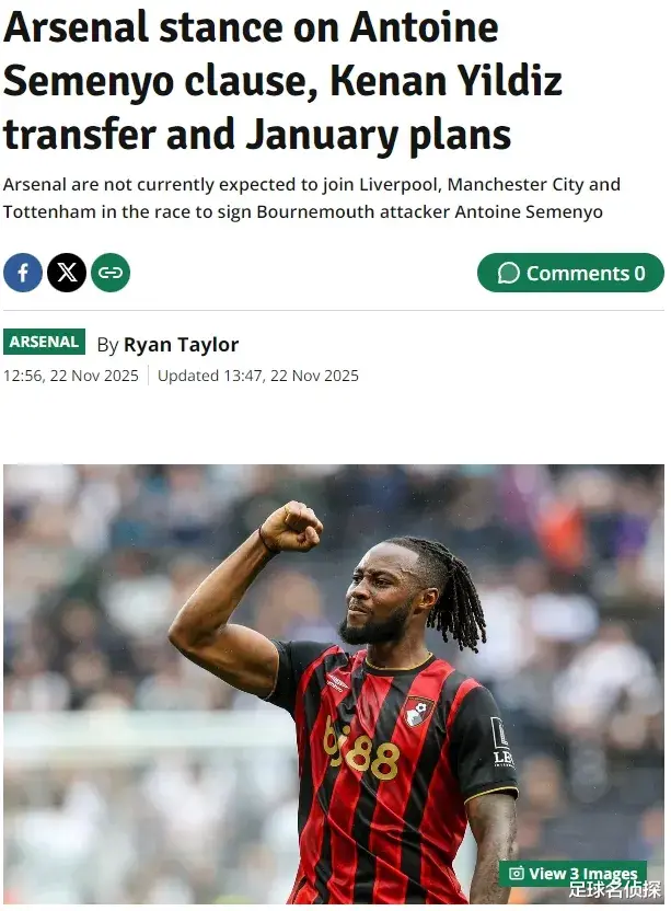 塞梅约合同中6500万英镑(6000+500)的违约金条款将在一月生效,利物浦、曼城和热刺都在争夺这名25岁的球星,但阿森纳并不打算介入,因为尽管北伦敦豪门依然符合PSR政策,但在满足欧足联的财务要求方面有一些亚力,除非阿尔特塔的球队出售球星,否则一月份买人是不现实的,不仅如此,阿森纳对自己的阵容也很满意。