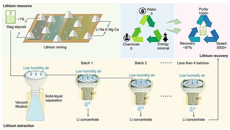 研究人员利用水合氯化锂(LHT)的吸湿性,从采矿废料中提取和浓缩锂。这种方法仅依靠空气中的水分,无需大量淡水或化学添加剂,实现了高达97%的锂回收率,并将锂纯度提升1500倍,产生的浓缩物锂含量达到97,000 ppm,是电池加工标准浓度的两倍以上。