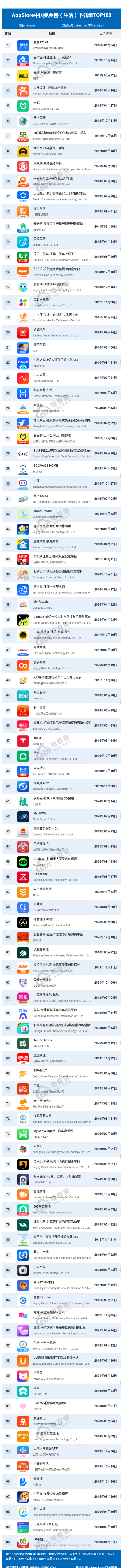 此外,落榜30名后的APP有:掌上12333、墨迹天气、影视大全、京东秒送骑士、浙里办、丰巢、海康威视、快手圈圈、e充电、职工之家、婚礼纪、链家、Tesla、国家政务服务平台、货拉拉司机版、中国移动和包、易车、达达秒送、自如、江苏智慧人社、黑猫投诉、理想汽车、小米汽车、全国12315平台、百度CarLife+、对对、闪送、UU跑腿、蔚来、平安好车主、亲邻开门、安居客、转转、58本地等。