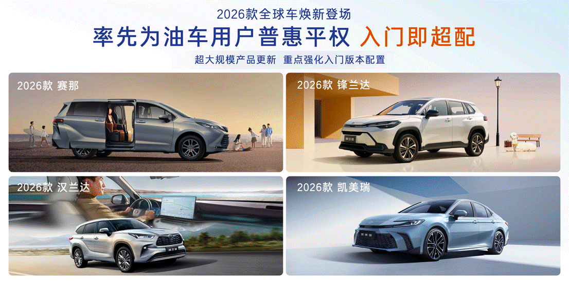 如果说这次产品升级用什么关键词最能概括,那一定是“入门价值大幅提升”。四款2026款全球车在智能化、高价值感等方面全面进阶,且多数升级均为“全系标配”。广汽丰田没有在顶配车型上堆砌“炫技型配置”,而是选择把用户最常用、最有感知、最需要的功能下放至入门版,直接提升入门版的高价值。