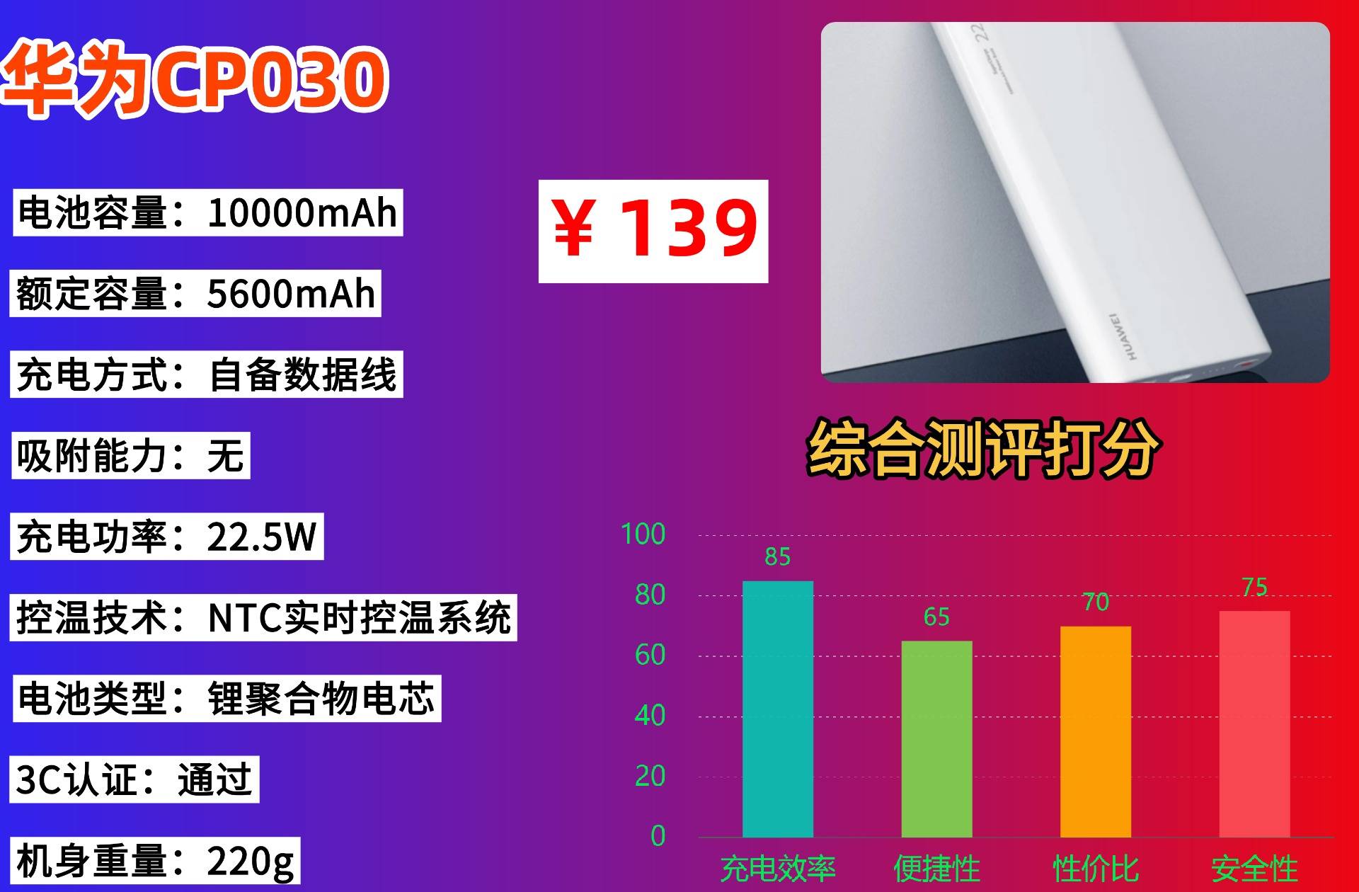 华为CP030充电宝是一款兼具高性能和便携性的产品,电池容量为10000mAh,额定容量为5600mAh,可以轻松为手机、平板等设备提供充足的电量支持。它的尺寸为150mm x 70mm x 14.2mm,净重220g,设计纤巧,非常适合随身携带,不会占用过多空间。充电宝支持22.5W的快充功率,可以高效为设备充电,节省了等待的时间。