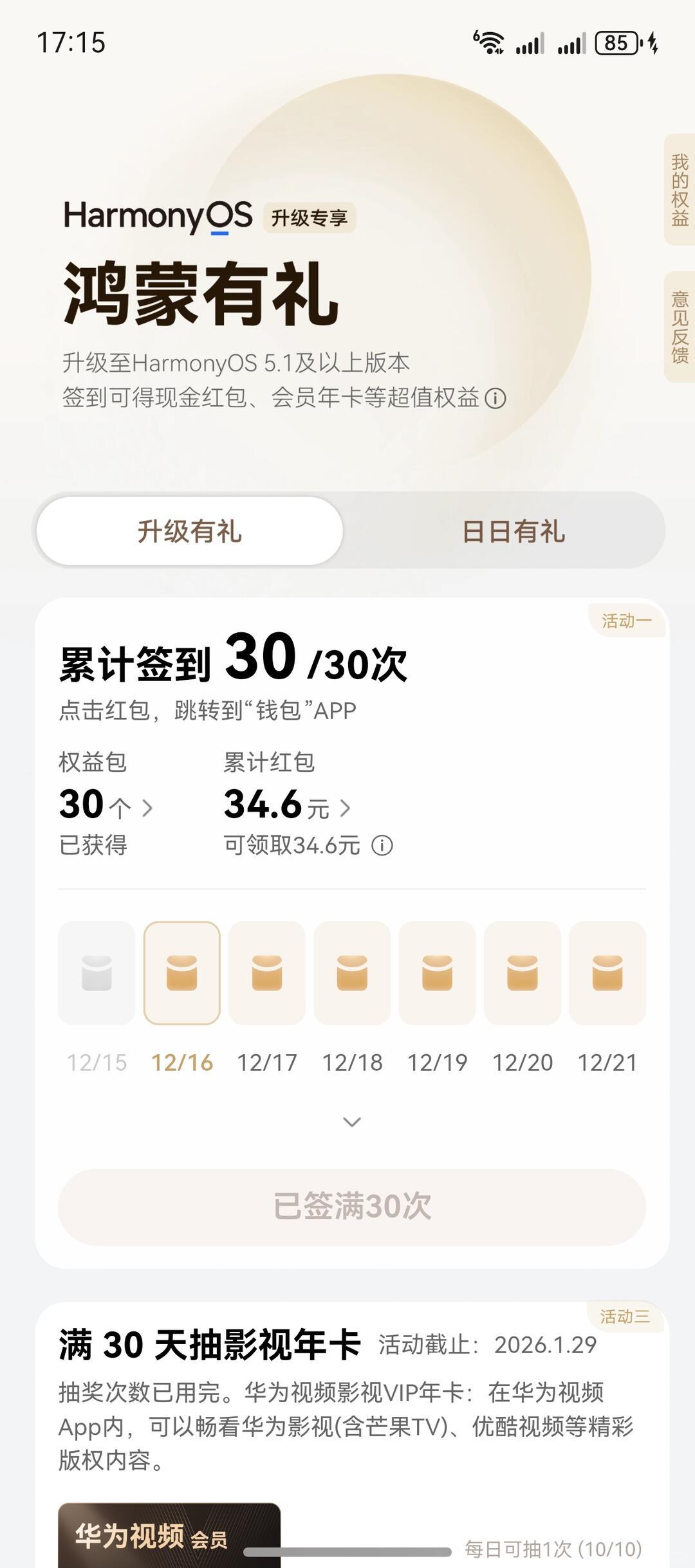 很多小伙伴想体验但又不想充会员的话,可以去领“鸿蒙有礼”,把手机系统升级到HarmonyOS 5.1及以上版本,不仅追剧体验感会更好,还有升级后的超多福利:手机右滑到负一屏,点击“鸿蒙有礼”活动,每天在“鸿蒙有礼“活动页签到,就可以领取红包和随机权益,随机权益包含华为会员权益、华为服务权益和热门应用会员权益三类。首次签到满30天后,还能参加抽影视VIP年卡的活动,在华为视频App内可以畅看华为影视(含芒果TV)、优酷视频等版权视频,还可以参与年卡免单券抽奖,有机会在哔哩哔哩、爱奇艺、WPS、夸克、知乎、优酷视频、喜马拉雅、芒果TV这八项热门应用年卡会员里任选其一,也算是增加了观影之外的额外福利!