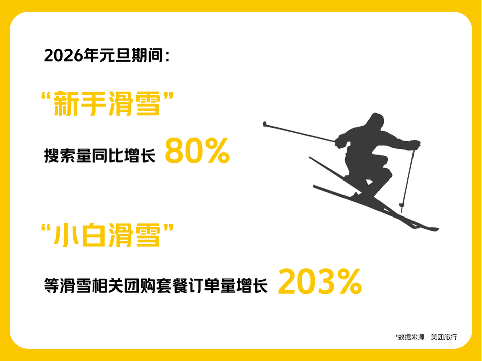 冰雪经济持续升温,“新手滑雪”搜索量同比增长80%,美团推出的“小白滑雪”一站式套餐订单量暴涨203%,降低了运动门槛。夜间消费与仪式感消费亮点突出,元旦前“跨年烟花秀”等关键词搜索量上涨500%,多地特色活动带动非传统旅游城市民宿预订量增长。