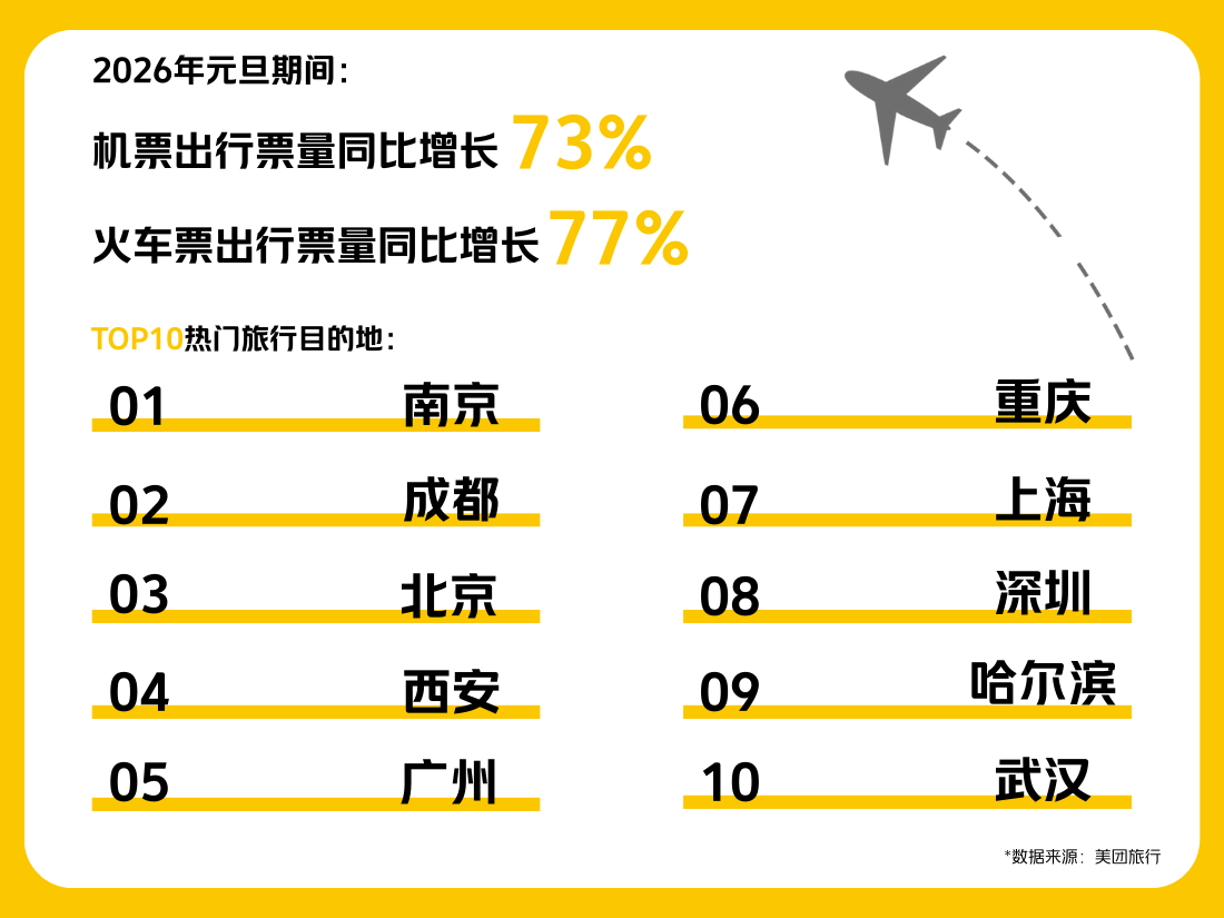 2026年1月4日,美团发布2026年元旦消费报告,机票出行票量同比增长73%,火车票出行票量同比增幅达77%,南京、成都、北京等十大城市成为热门旅行目的地,科技赋能下的多元化消费场景正重塑新年假期生活方式。