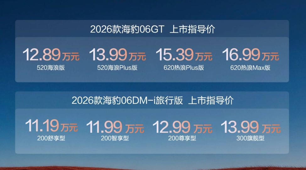 2026款海豹06GT和2026款海豹06DM-i旅行版两款新车均提供四个配置版本,26款海豹06GT售价区间为12.89万至16.99万元;26款海豹06DM-i旅行版售价区间为11.19万至13.99万元。