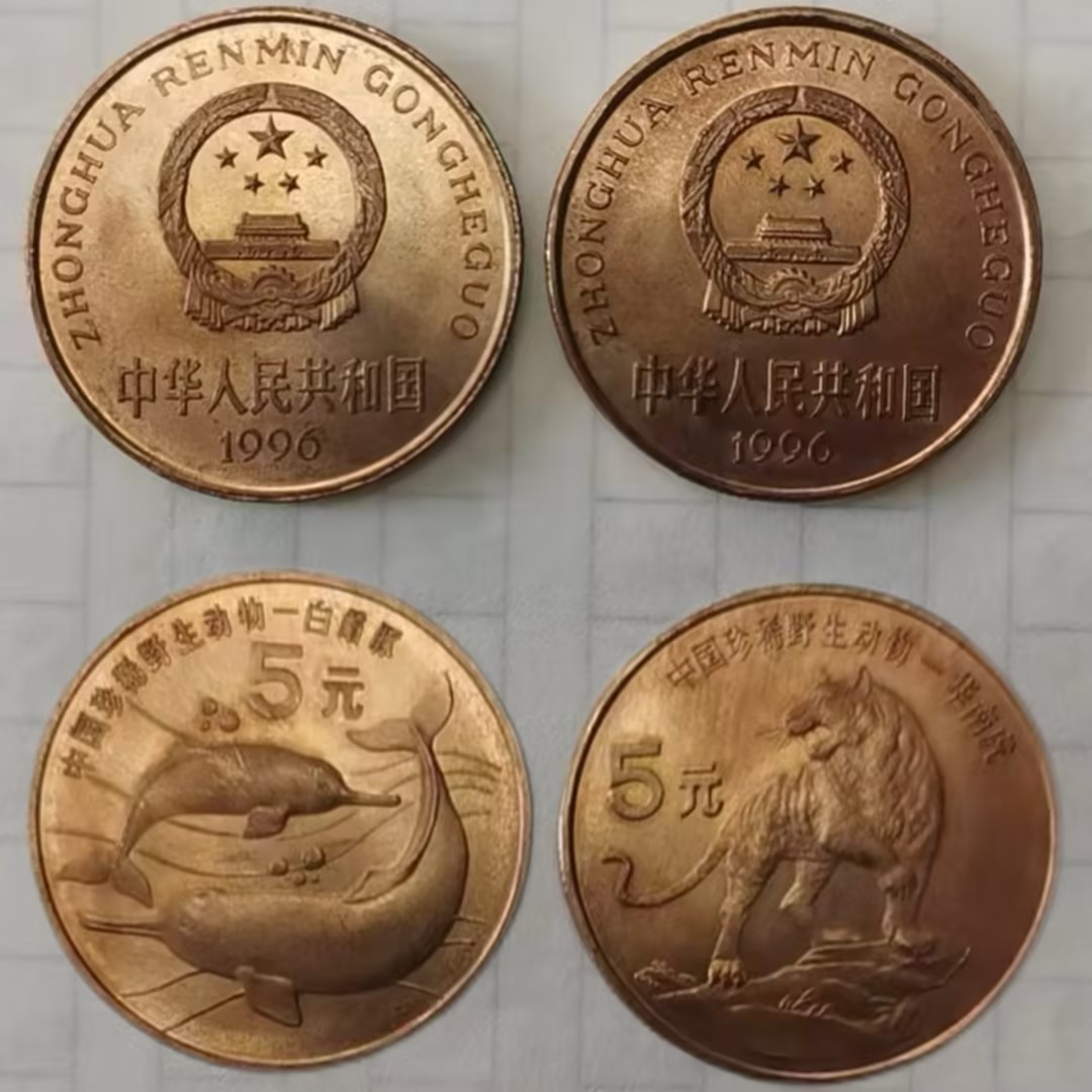 1996 年白鳍豚、华南虎纪念币,发行量各 600 万枚;