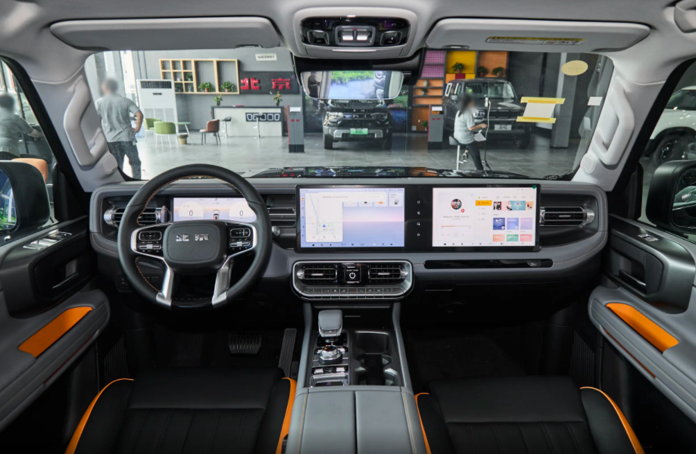 而除了数字仪表之外,2026款北京越野BJ40还拥有12.8英寸的中控屏幕和副驾驶娱乐屏幕,这也让其车内的科技质感更加的突出,但是中控屏幕与副驾驶娱乐屏幕之间的黑色边幅还是比较大的,会影响一定的视觉效果,所幸在屏幕当中的UI界面比较简单,上面显示的功能还是比较全面的,且在高通8155车规级芯片的加持下,屏幕的流程程度也是有所保障的。至于屏幕内的功能配置上,2026款北京越野BJ40的表现也是不差的,像导航系统和语音控制等功能,该车全都配备,满足我们的日常所需还是没啥问题的。