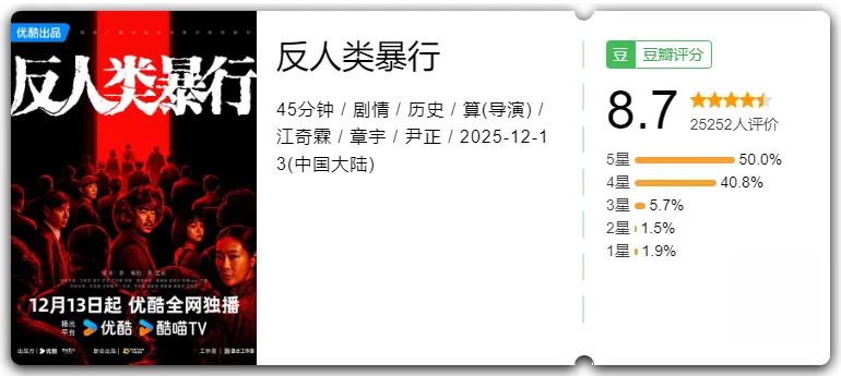 行至年末,国产剧迎来豆瓣年度最高分——目前已涨至8.7的《反人类暴行》。