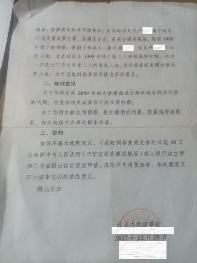 此后,卢先生开始进行维权。其多次与村子里负责人沟通协商,寻求解决方案,均被以“户口已迁移”为由拒绝处理,其认为相关处理存在故意推诿。随后,卢先生将信访材料提交至镇纪监部门,工作人员因对相关政策不了解,采信了村子里负责人与村民小组长的说明,作出处理结论,卢先生的维权诉求未得到解决。据卢先生反映,部分村干部态度生硬,认为其无论向哪个部门反映,最终仍需当地处理,未正视工作中可能存在的问题。