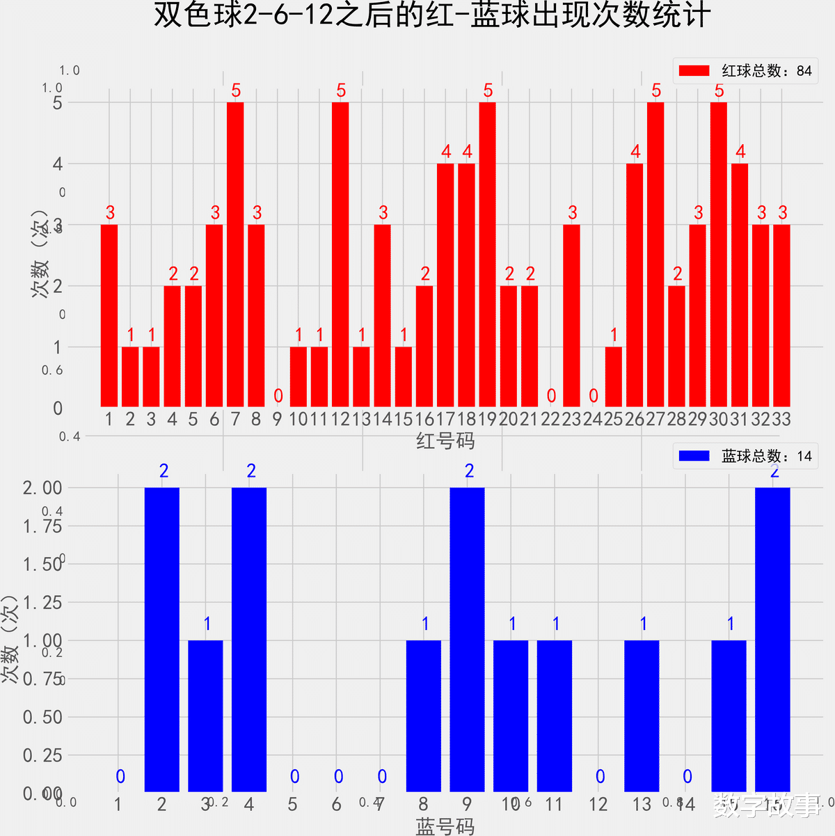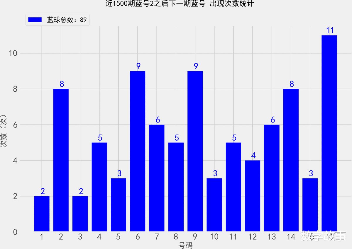 统计近1500期蓝号2之后, 各蓝球的出现次数双色球26035期蓝号是2找出近1500期蓝球2号之后, 下一期出现的所有蓝号,统计其出现次数。,除开这一期,总共出现了89次2号球那么统计的样本数据是89个