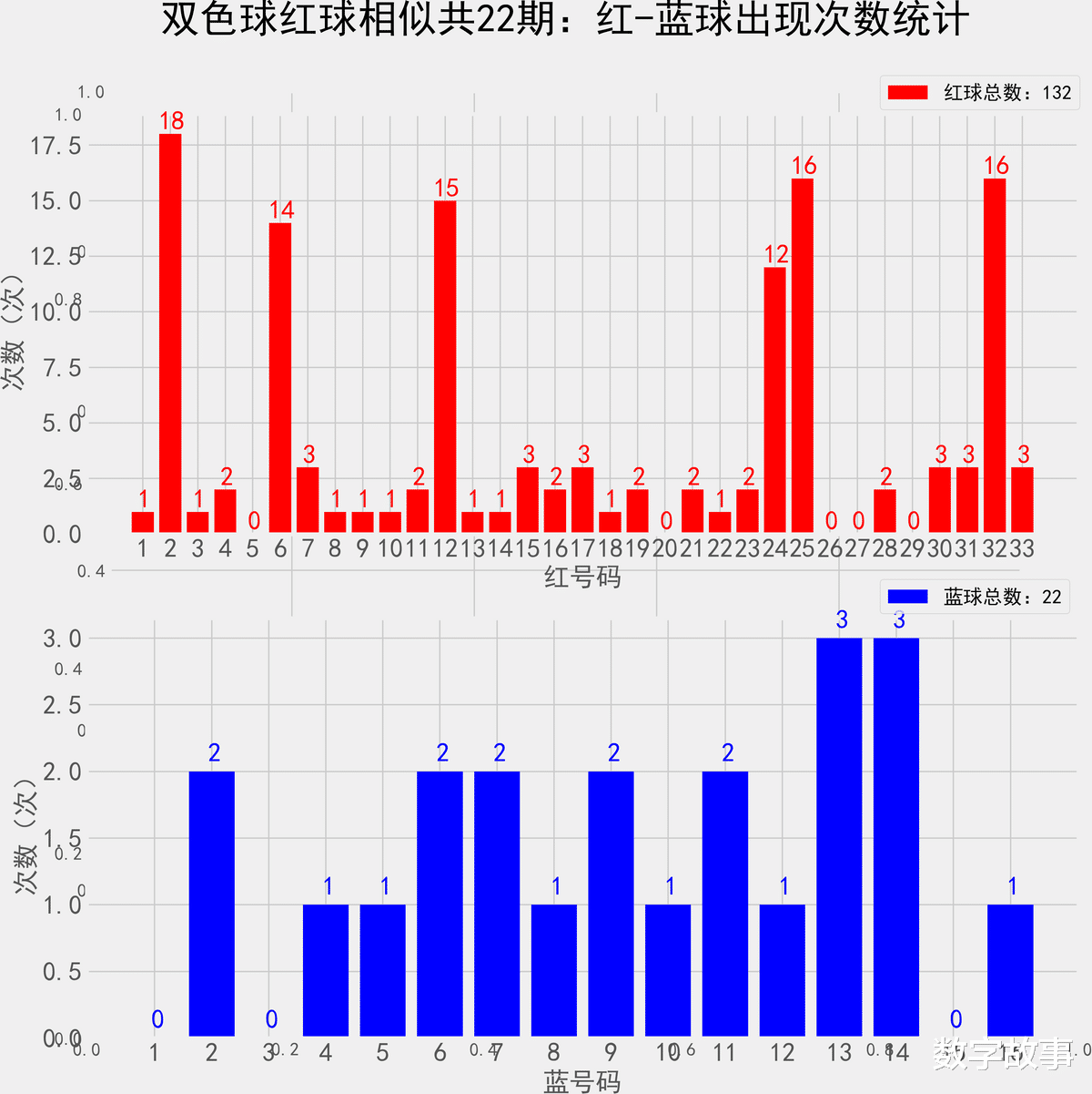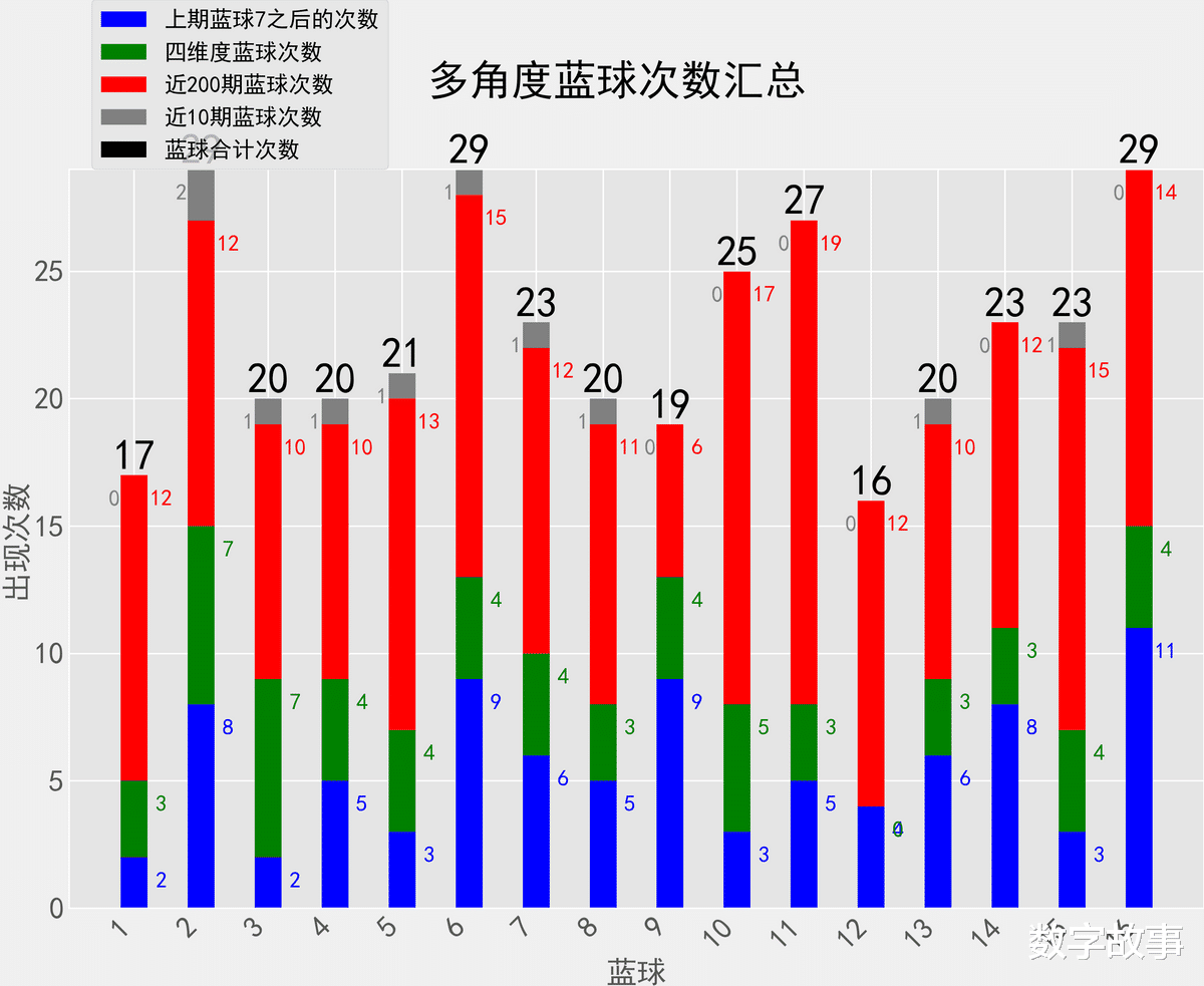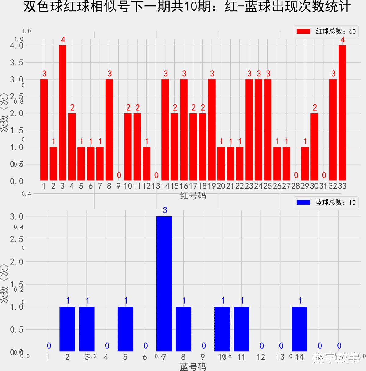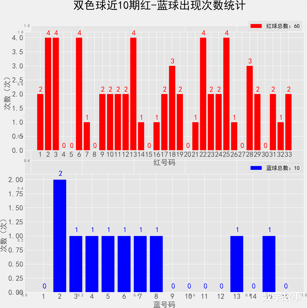 双色球近10期红蓝号统计情况统计样本数据: 60个红球 10个蓝球