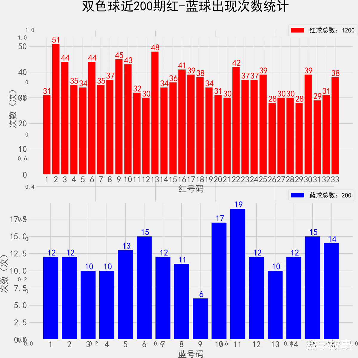 双色球近200期红蓝号统计情况统计样本数据: 1200个红球 200个蓝球