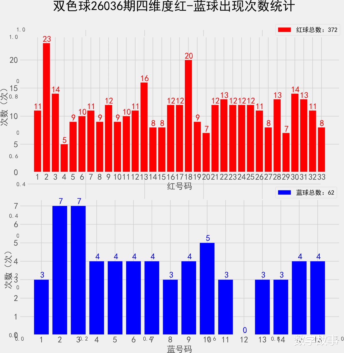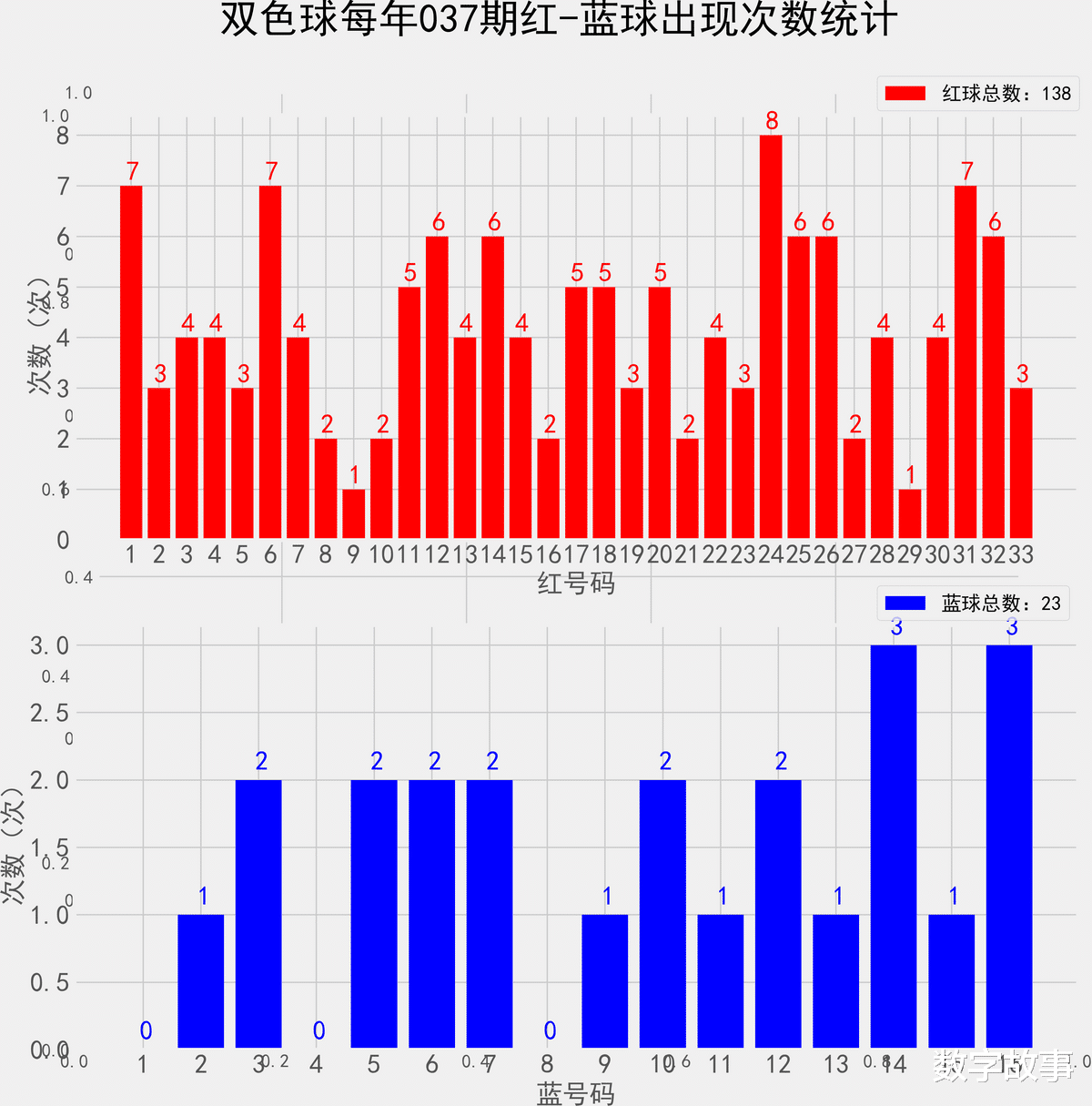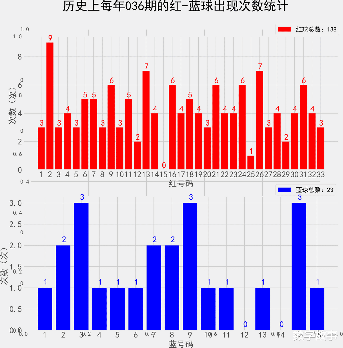 统计每年036期的样本数据:138个红球 23个蓝球